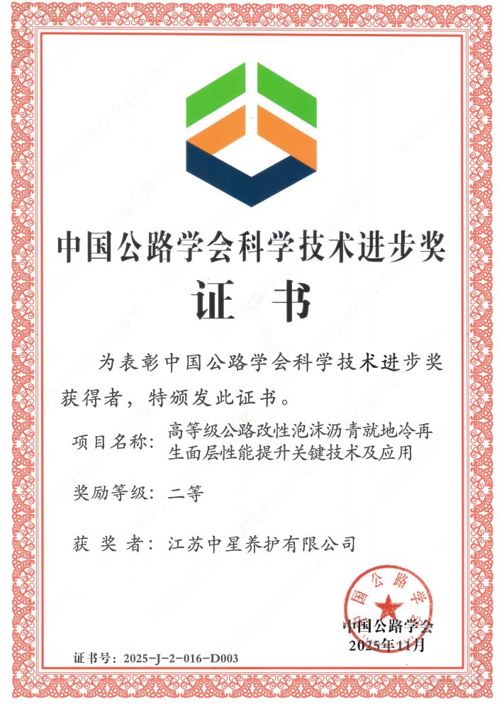 近日,中国公路学会正式发布了2025年度中国公路学会科学技术奖获奖结果,中星养护作为主要单位申报的《高等级公路改性泡沫沥青就地冷再生面层性能提升关键技术及应用》项目,荣获科技进步二等奖。